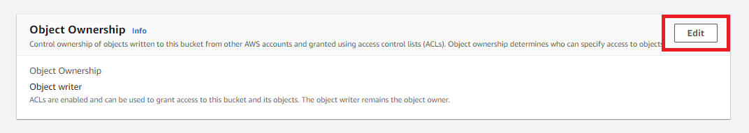 [ { "AllowedHeaders": [ "*" ], "AllowedMethods": [ "POST", "PUT", "GET", "HEAD", "DELETE" ], "AllowedOrigins": [ "*" ], "ExposeHeaders": [ "ETag" ], "MaxAgeSeconds": 30000 } ] - Step 3: Go to your newly created S3 Bucket click on Permissions -> Object Ownership and click Edit.