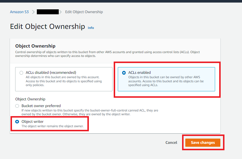 - Step 4: Select ACLs enabled and Object writer and click Save Changes.