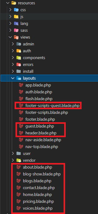 - Step 1: All files that are used as frontend pages or for frontend can be found under resources/views and couple files under resources/views/layouts directories as shown in the picture.