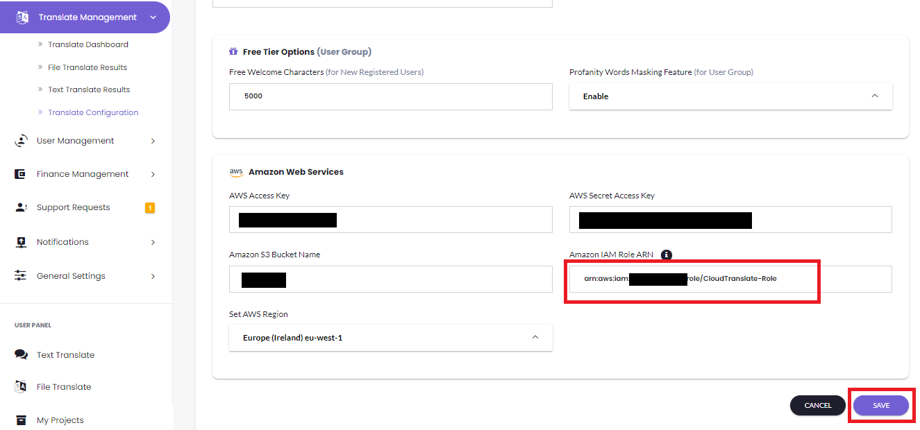 - Step 13: To start using Cloud Translate features, enter AWS API Keys and a Bucket Name under Admin Panel - Translate Management - Translate Configuration. Important! You will also need to create a specific IAM Role ARN to be able to use this script. Follow the documentation under AWS Setup tab under Role ARN Setup option.