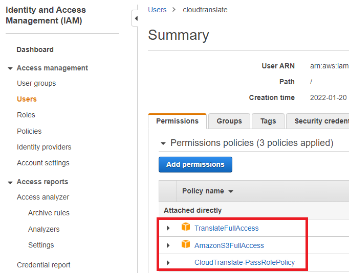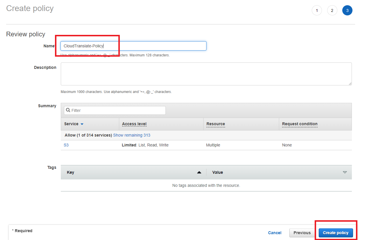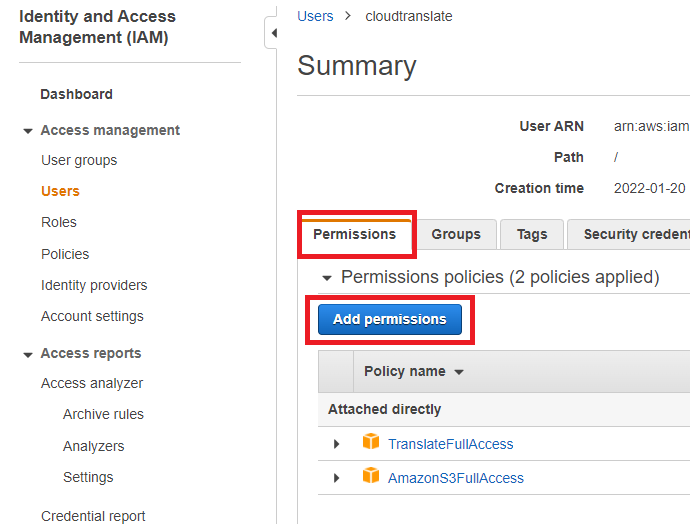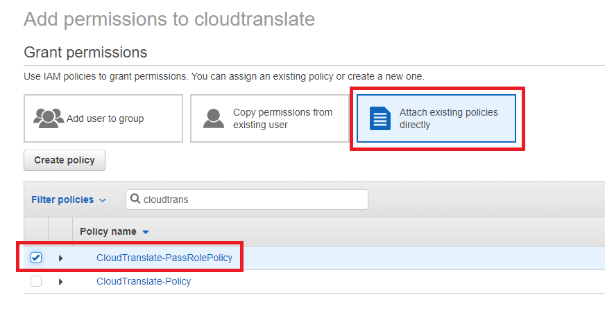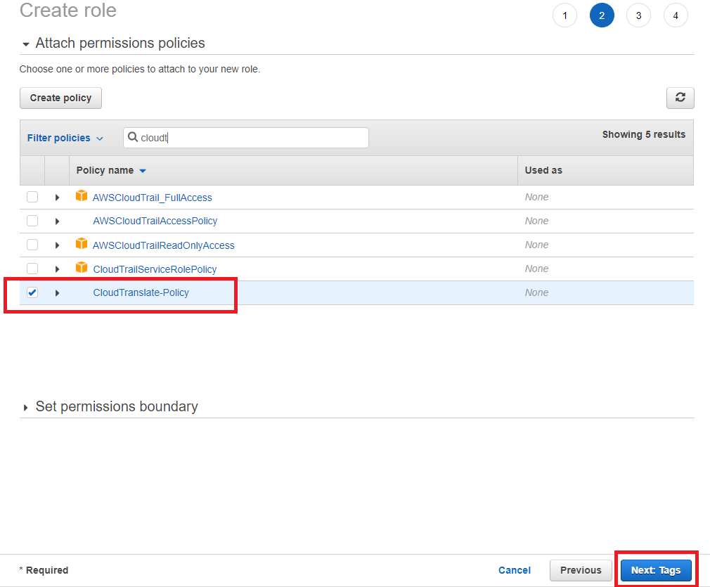 - Step 7: Seach for AmazonS3FullAccess and TranslateFullAccess, select both afterwards select click Next: Review