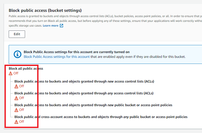 - Step 1: Make sure your Permissions -> Block Public Access looks at least like this and has all 4 options turned off.